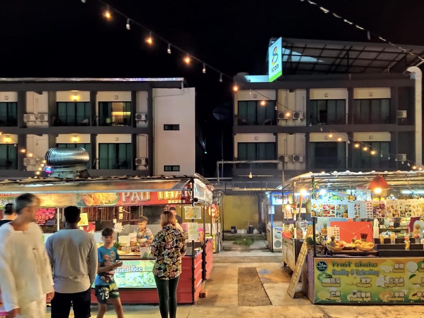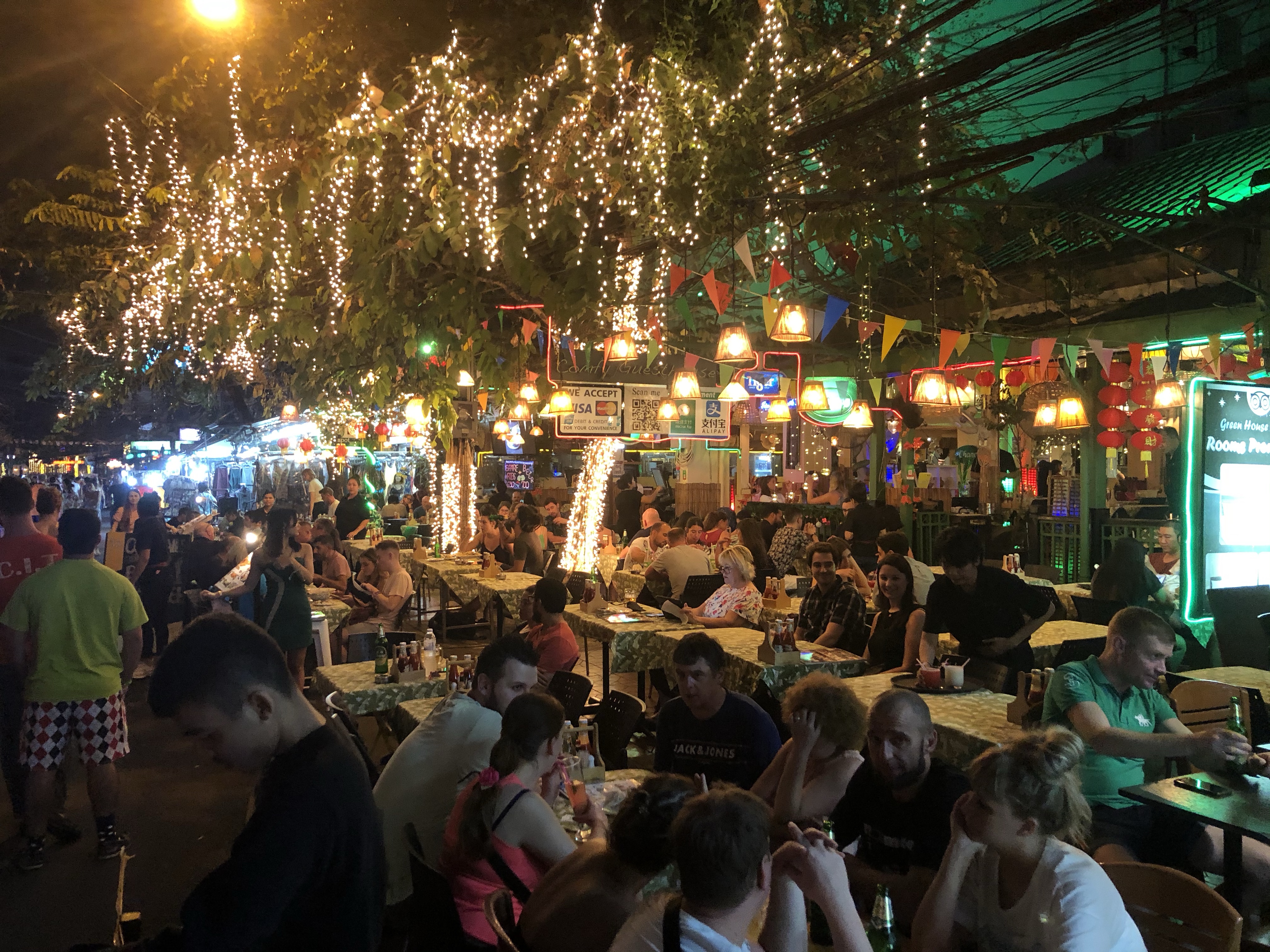 Und auf einmal fühle ich mich nicht mehr wie in Thailand. Von links nach rechts gedrängt lärmt die Musik aus drei verschiedenen Richtungen, betrunkene Touris und feilschende Verkäufer sprechen uns von allen Seiten an. Nach einem kurzen Abendessen an einem etwas abgelegeneren Stand treten wir geschafft den Rückzug an.