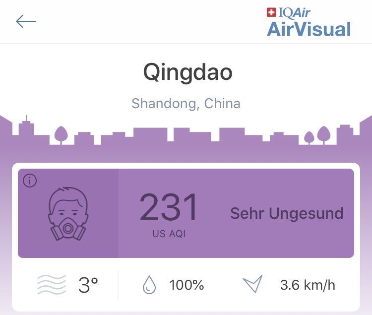 Es wird kalt und mit der Kälte kommt der Smog, der bis dato noch zurückhaltend war. Der Luftqualitätsindex AQI, der über verschiedene Luft-Werte informiert, schießt plötzlich fast täglich über 200, was als „sehr ungesund“ eingestuft wird. Ich kaufe mir eine Atemmaske, mit der meine Brille ständig beschlägt, von der Nase rutscht oder sich mit den Gummihaltern verhakt. Äußerlich könnte ich nun bei den Stormtroopers vorsprechen. Höchste Zeit, die Stadt zu verlassen.